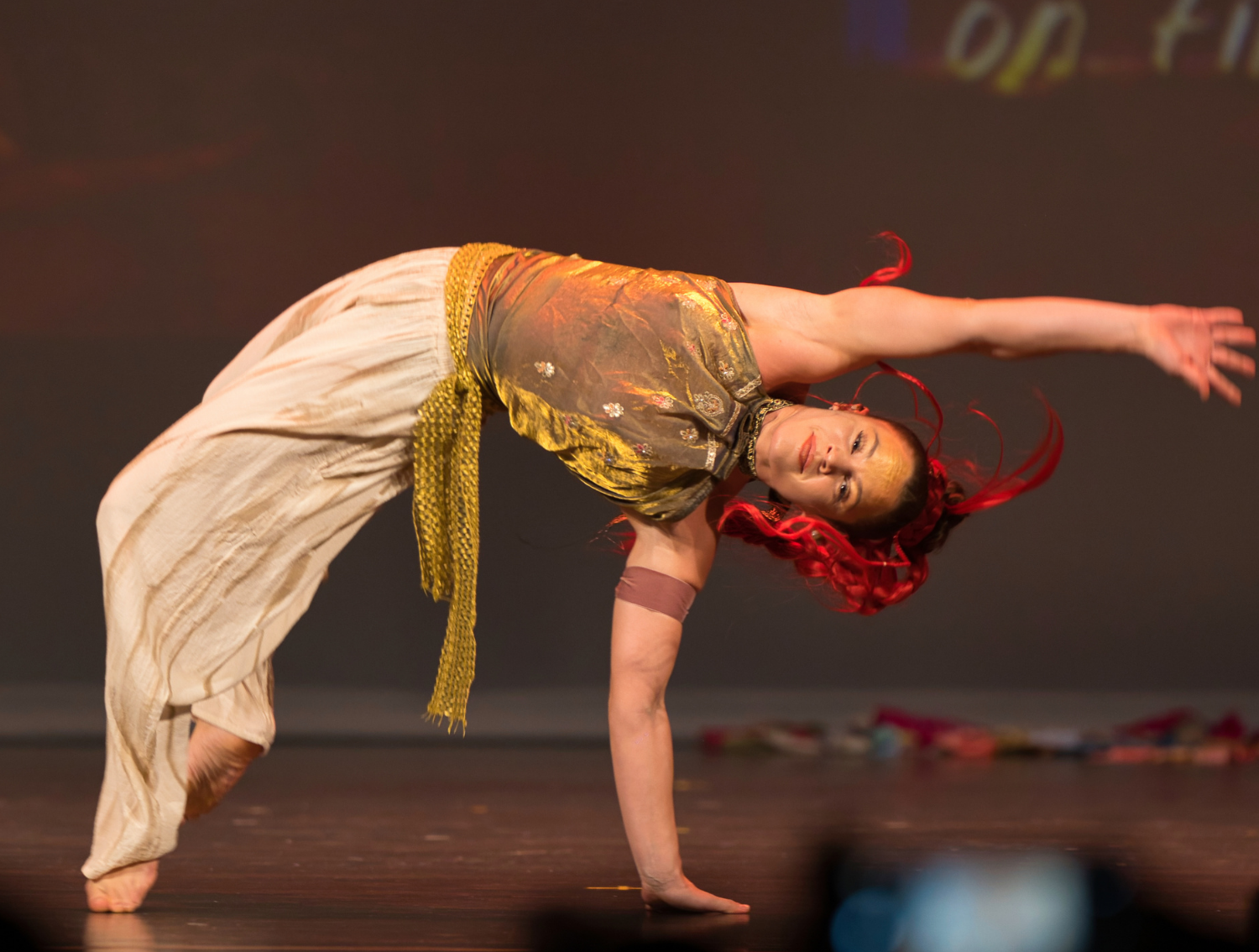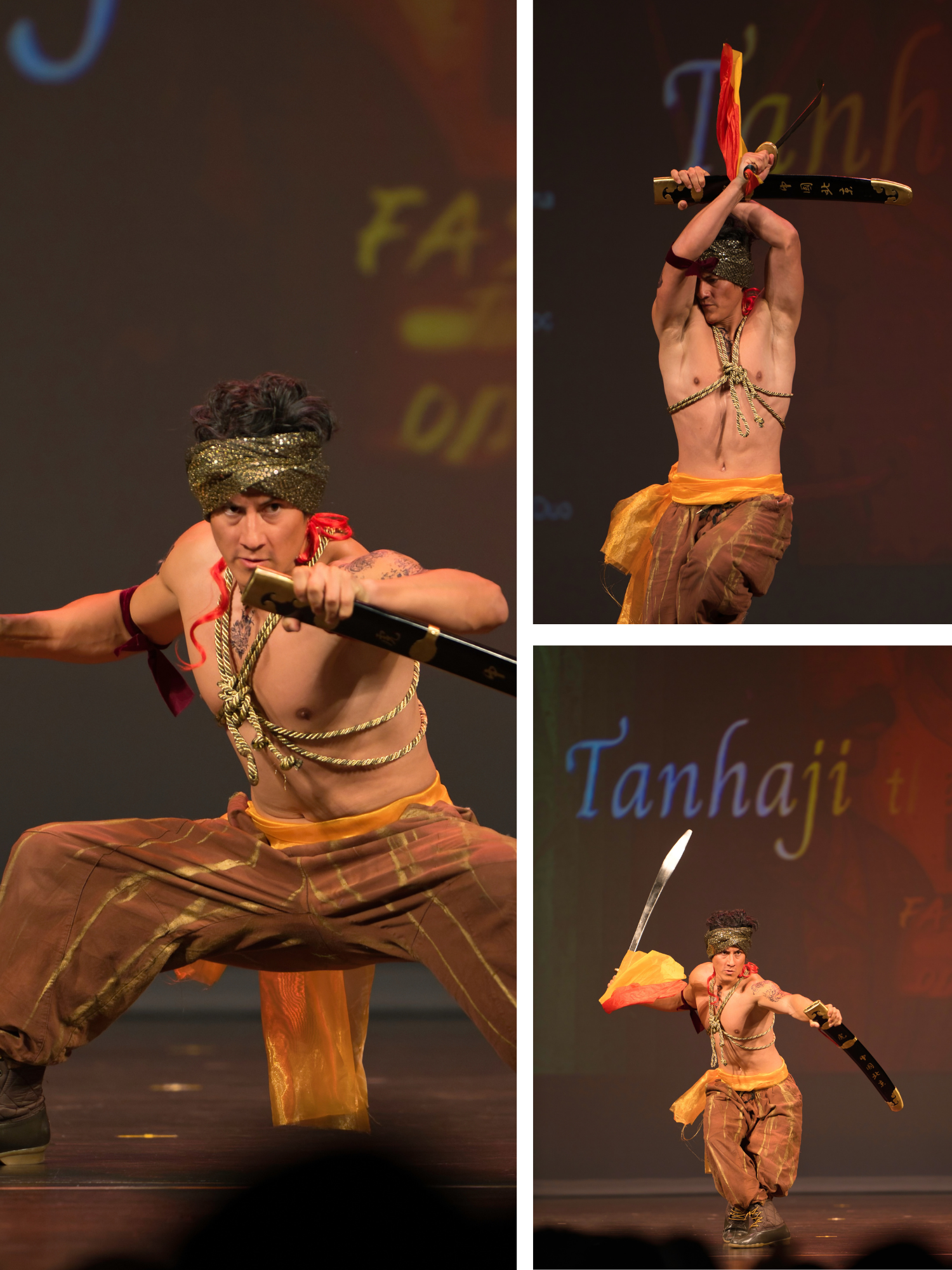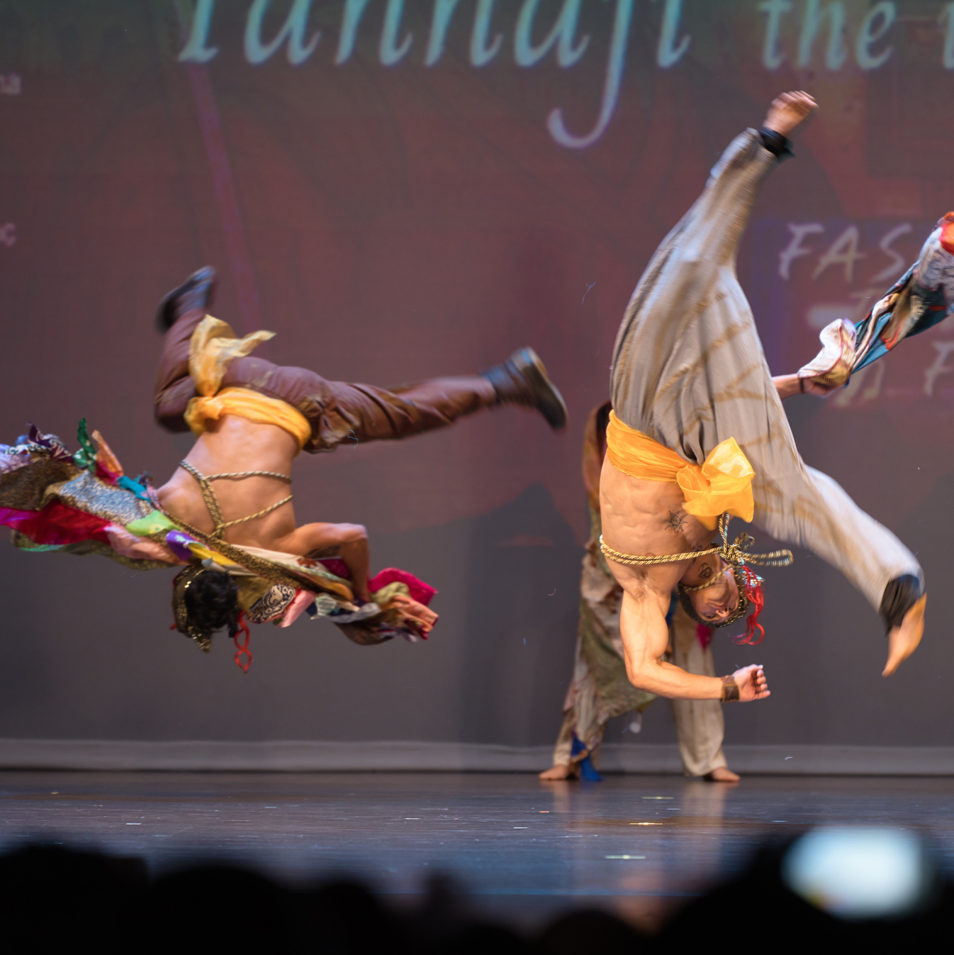 But it was the acrobatics that elevated this from dutiful historical recreation to something genuinely breathtaking. Mid-performance, bodies became projectiles. One particularly arresting moment captured a warrior suspended in full backbend, horizontal to the stage, sword and flag extended as gravity seemed negotiable. Another showed what can only be described as synchronized aerial combat—two performers launching into mirrored flips, their costumes a blur of earth tones and metallic accents against the stage lights.