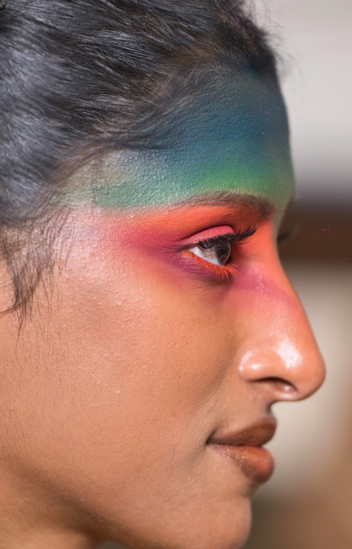 The makeup alone deserves its own monograph. One performer's face became a canvas for what can only be described as sunset rendered in cosmetics: a gradient wash that began with deep teal at the temples, dissolved into jade green across the orbital bone, then ignited into coral and hot pink before settling into a peachy glow at the cheekbones.
