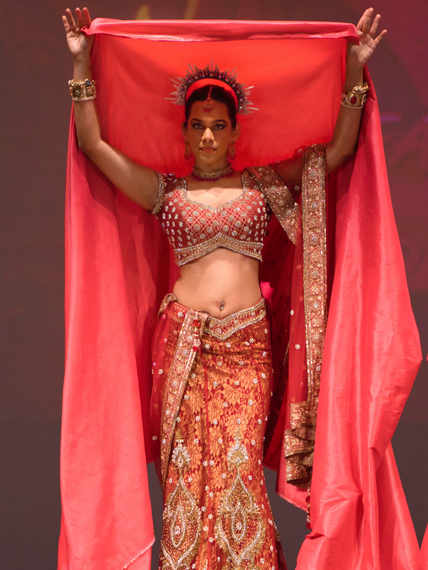 The romantic interlude provided necessary ballast to all that martial energy. Enter the female lead in a lehenga that could only be described as architectural—layers of red silk heavy with gold and crystal embroidery, topped with a crown that radiated spikes like a sunburst. The costume design here deserves particular note: while the male performers wore variations on harem pants and minimal torso covering (the better to display their athleticism), the women were draped in textile opulence that managed to be both historically evocative and utterly contemporary in its craftsmanship.