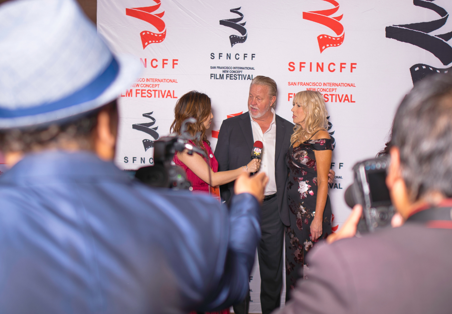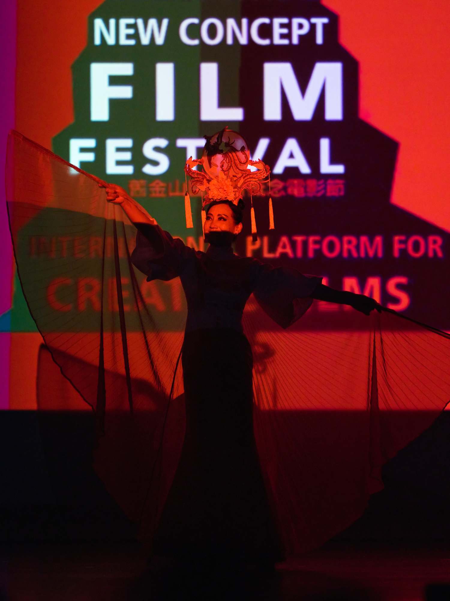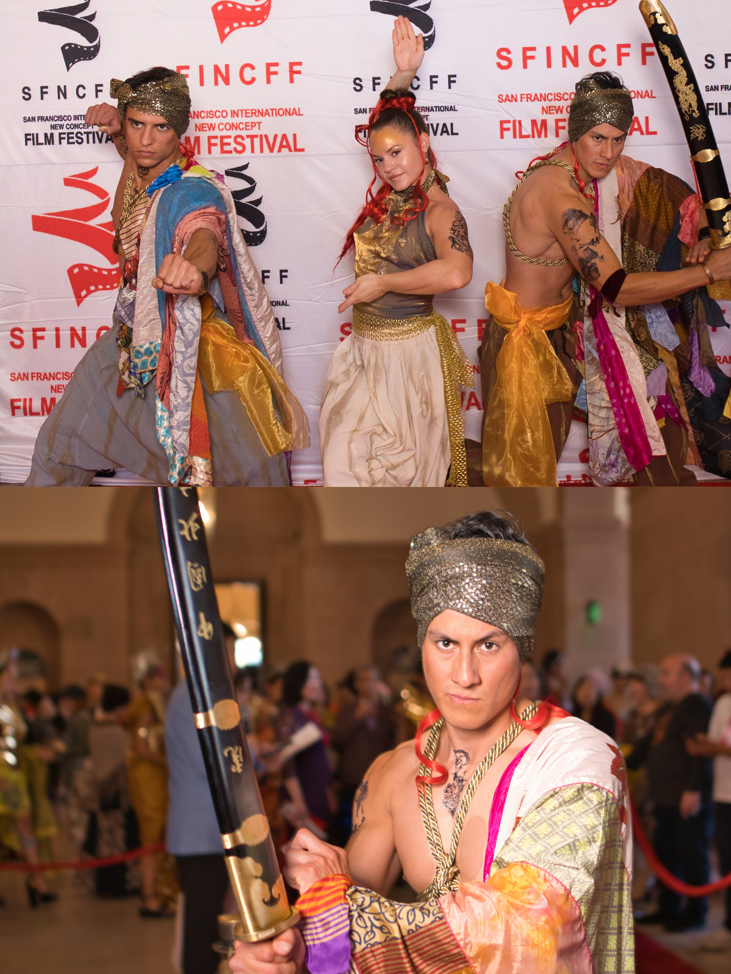 The red carpet arrivals provided their own theater. Against the repeating logos of the San Francisco International New Concept Film Festival, performers struck poses that blurred the line between documentation and performance art. Three warriors—their costumes a riot of metallics, flowing pants, and strategically placed draping—adopted martial stances with the self-aware irony of people who understand they're performing "warrior" for an audience that might otherwise be photographing tech entrepreneurs or film directors.