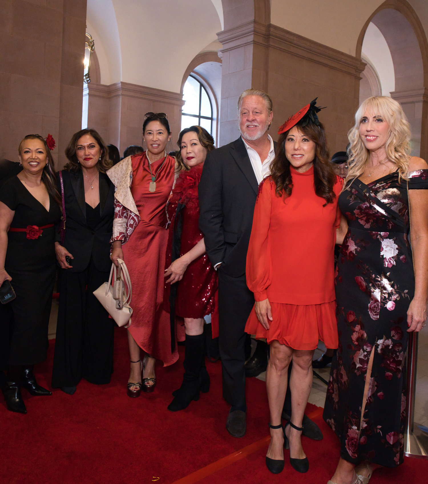 The evening's success, of course, required more than aerial prowess and historical ambition. Even before the house lights dimmed, the venue's arched corridors—lit by brass lantern fixtures that could have been lifted from a colonial-era hotel—became their own kind of stage. Here, in a telling photograph, the evening's power players assembled in a study of strategic color coordination: California State Treasurer Fiona Ma commanding attention in a coral-red ensemble complete with a sculptural fascinator, flanked by collaborators in black punctuated with crimson accents. It's the kind of image that speaks volumes about who understands the assignment when "charitable gala" meets "cultural spectacle."