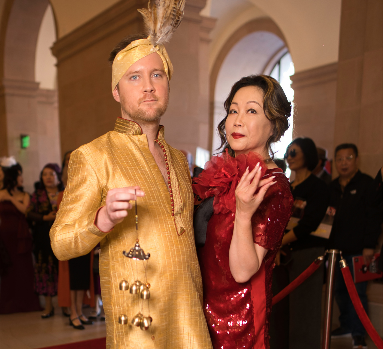 Among the civilian attendees, actors John Lacy and Rachel Bailit brought the particular appreciation that only fellow performers can offer. Lacy, game enough to don a golden silk kurta and yellow turban with peacock feather plume, posed with Bailit in her crimson sequined qipao—the two of them a study in what happens when performers commit fully to a theme without losing their sense of play. They understood, perhaps better than most, the hours of rehearsal required to make those synchronized flips appear spontaneous, the core strength necessary to hold those poses, the breath control needed to perform acrobatics while maintaining character.
